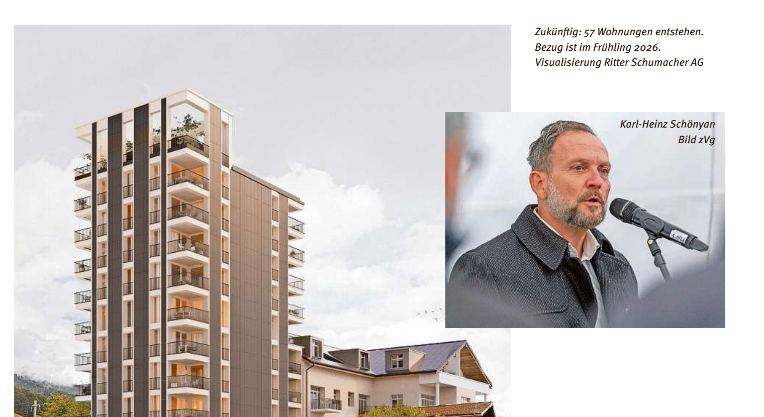Der Rohbau des neuen Mühleturms verkörpert unsere Vision für modernen und nachhaltigen Wohnraum. Anstelle des früheren Getreidesilos ragt jetzt ein eleganter, 30 Meter hoher Turm mit zeitgemässer Solarfassade in den Himmel.